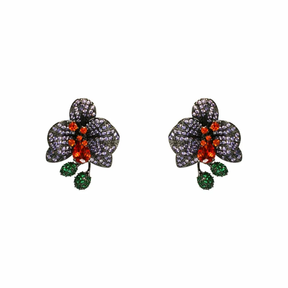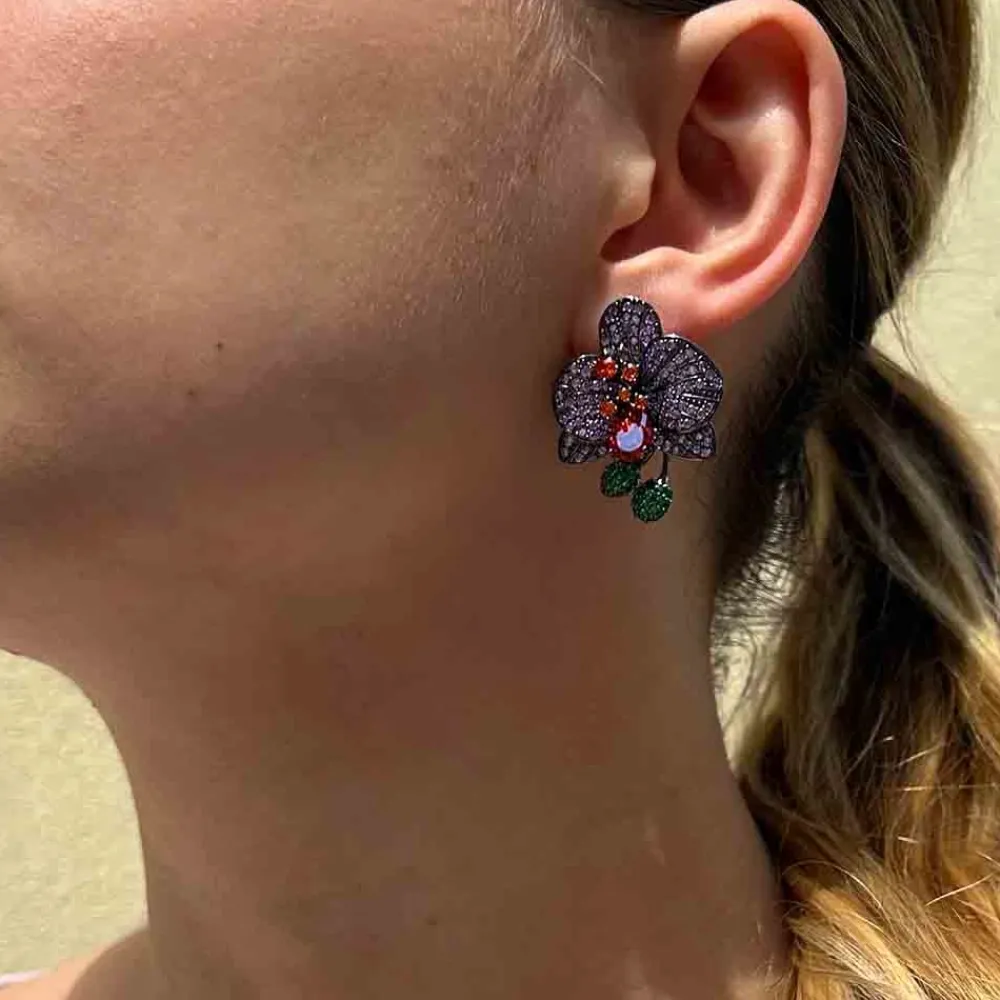 Des boucles d’oreilles scintillantes en forme de fleurs strassées de coloris violet, rouge, orangé et vert. Sophisti…