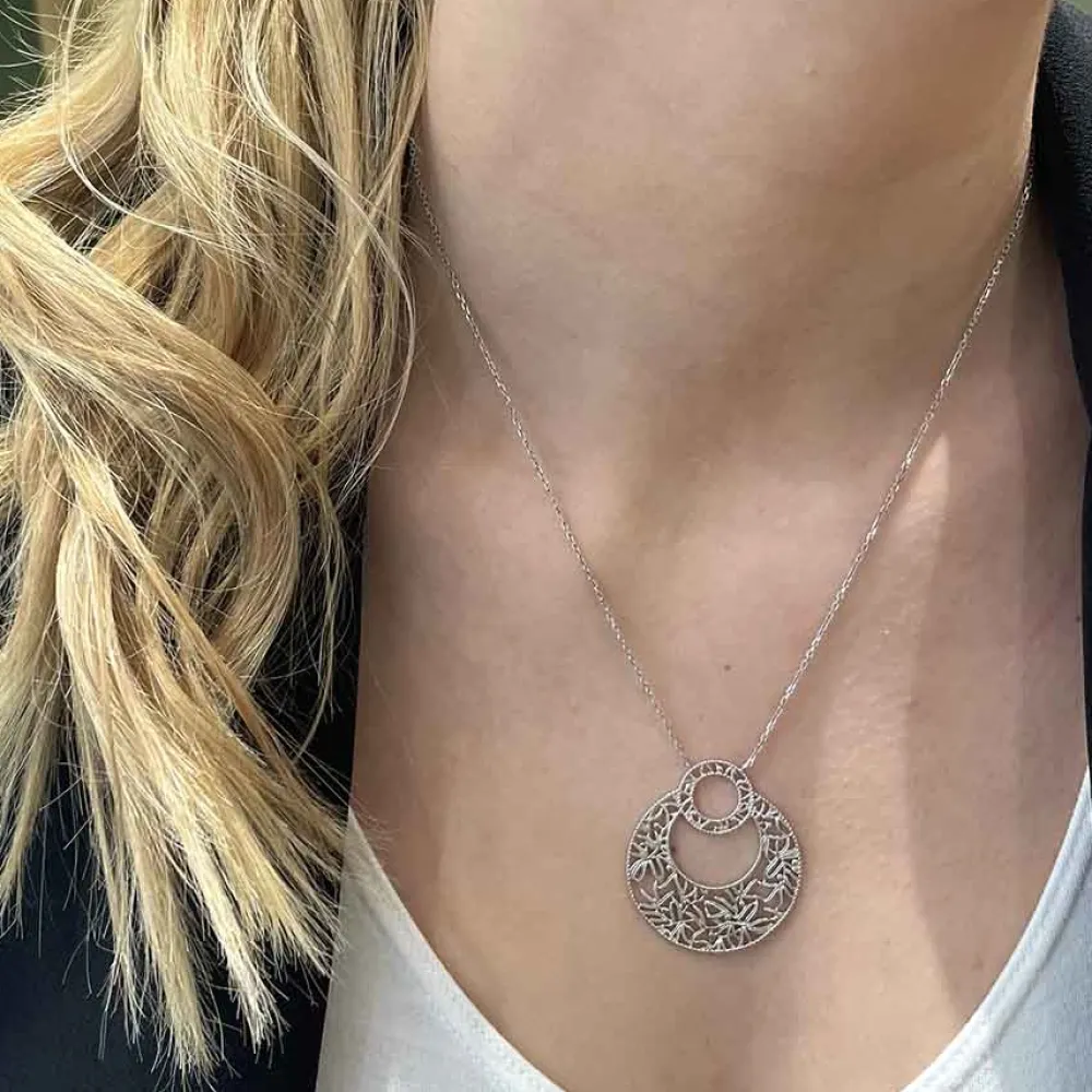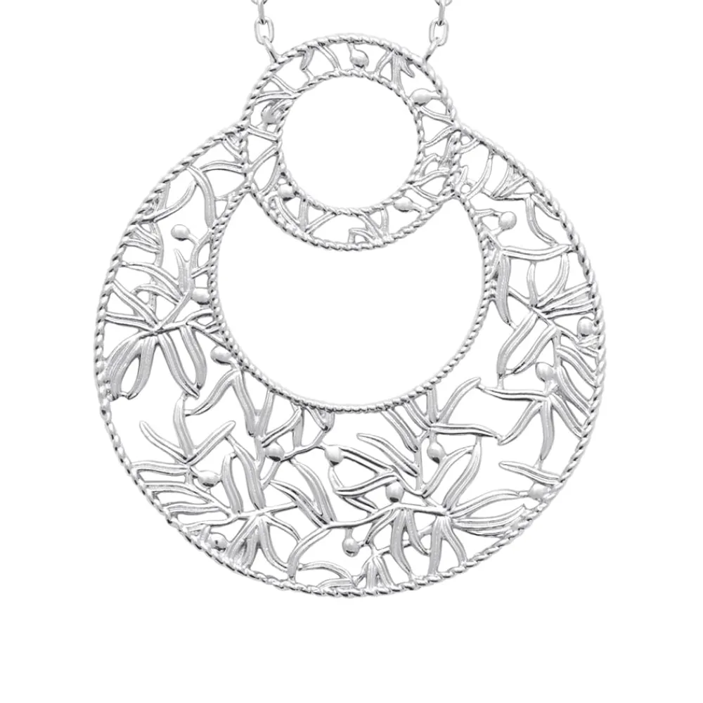 Signé By Jollia, Collier en argent 925 Boheme Végétale arborant un pendentif rond complètement ajouré façon filigrane reprenant un motif floral et laissant apparaître la peau. Présent et léger à la fois.