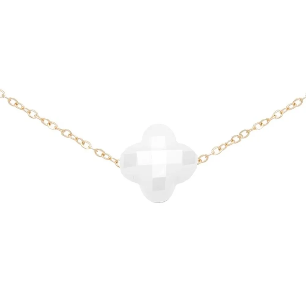Ce collier trèfle facetté blanc en plaqué or 3 microns est signé By Jollia.Longueur déployée : 44 cm, avec possibi…