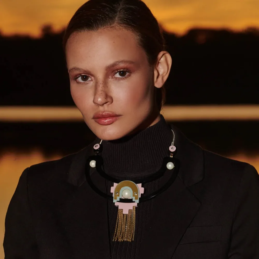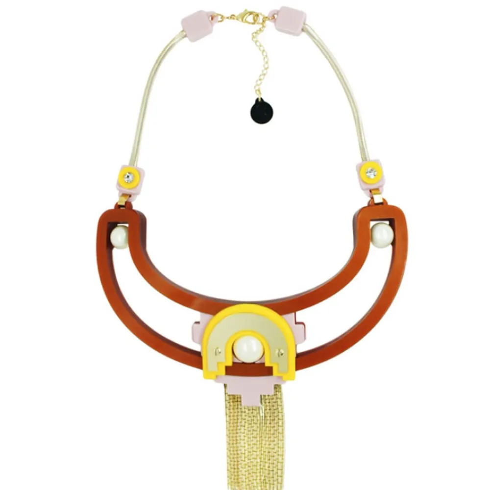Collier signé Gissa Bicalho. Collier court en acrylique avec application de métal et frange de chaînes, perle de cristal et strass en verre.