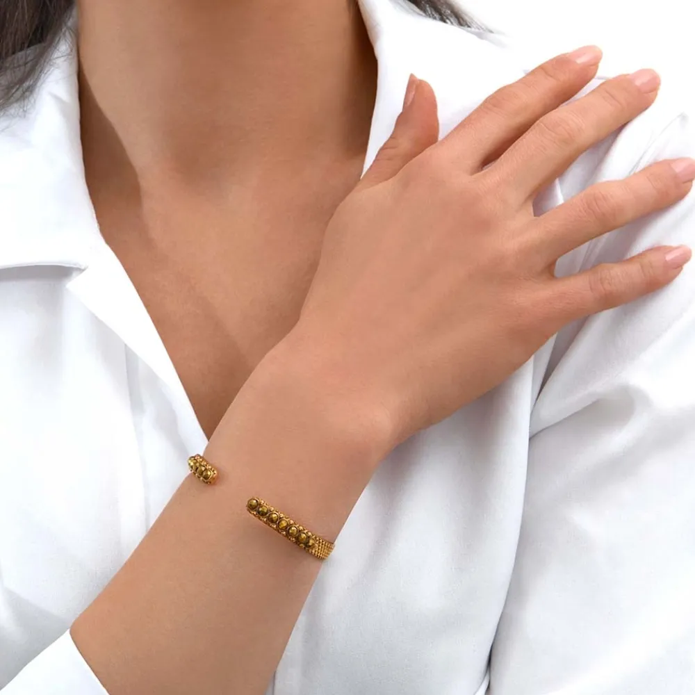 Ce bracelet jonc ouvert en plaqué or 3 microns est signé LA2L. Il est composé de pierres dorées.