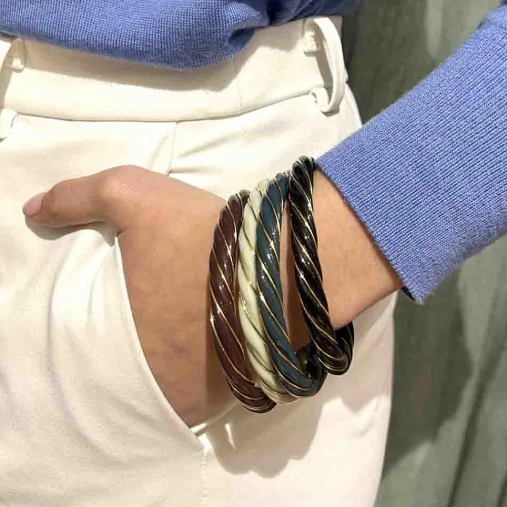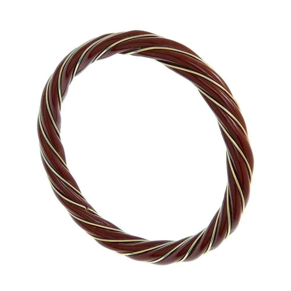 Bracelet couleur brique signé LA2L, décoré de torsade en résine et fil de laiton doré.