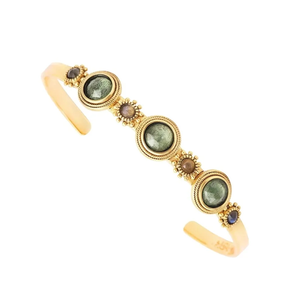 Bracelet jonc en laiton bain d’or 24 carats et pierres semi précieuses.Pierres : – Serpentine / Labradorite-Épaiss…