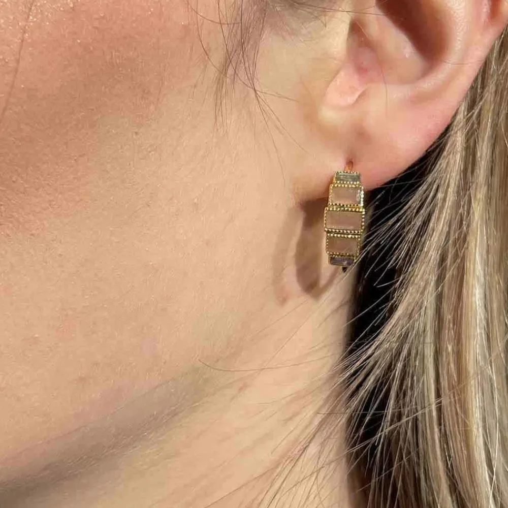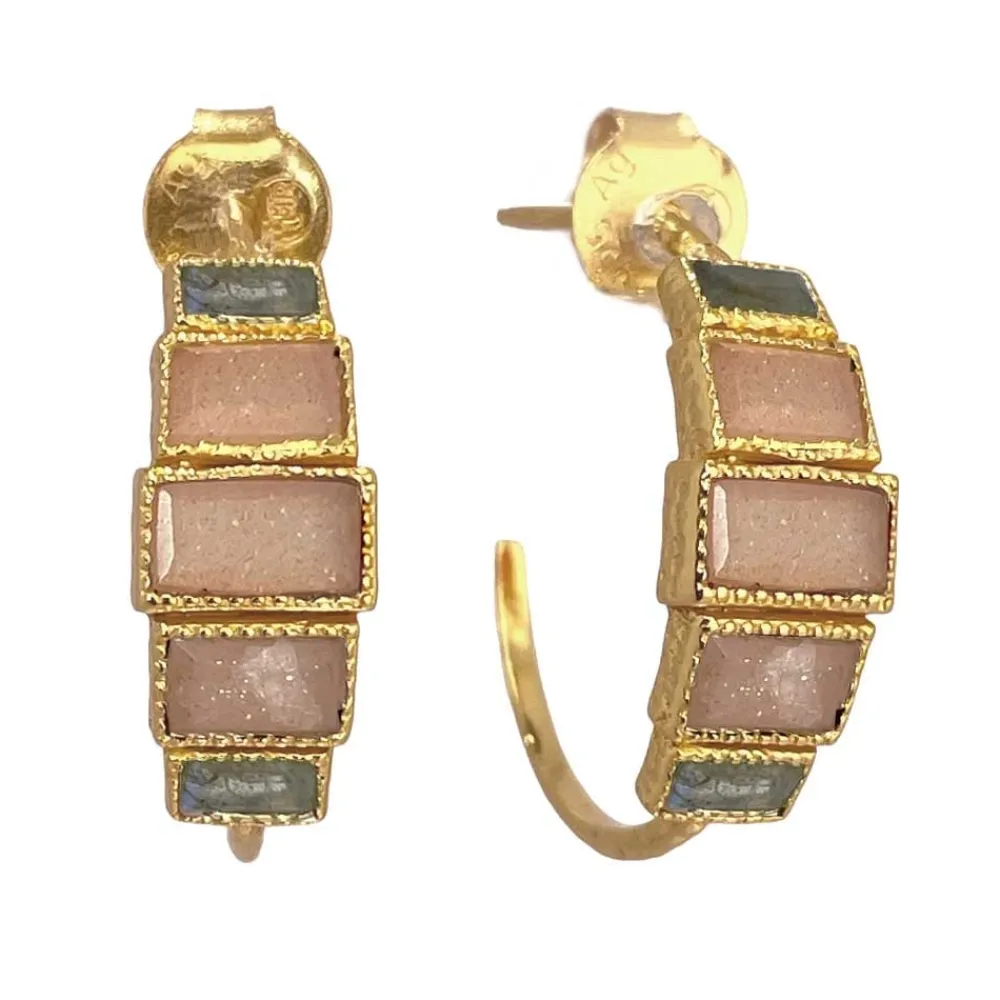 Signé Muja Juma, boucles créoles colorées rose multi-pierres.