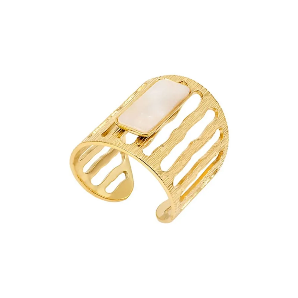 Cette bague réglable, en acier chirurgical trempé dans un bain doré et signé Siloé, est agrémentée d’une pierre ivoire.