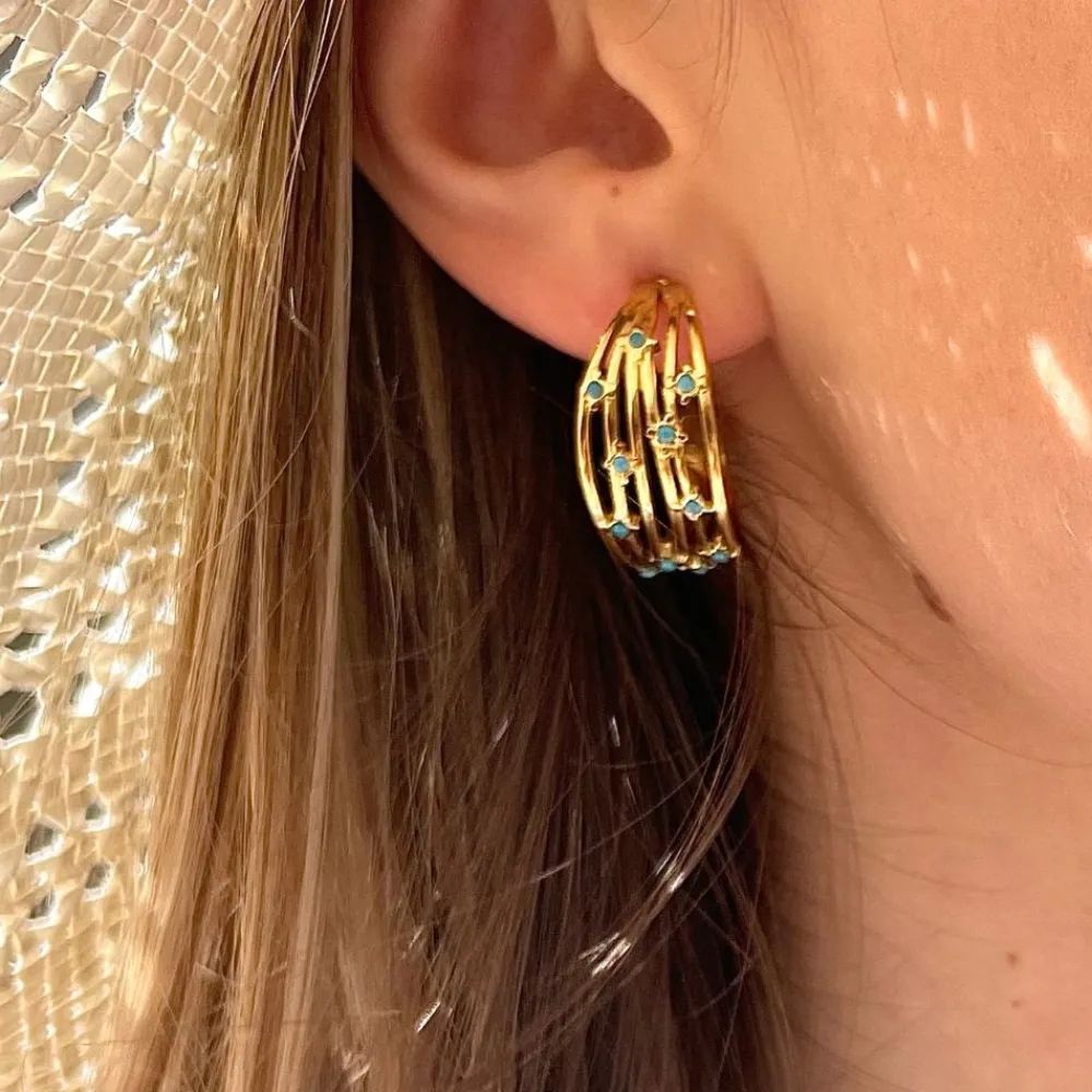 Ces boucles d’oreilles créoles en acier inoxydable sont ornées de charmantes étoiles serties de pierres turquoises facettées. Leur design céleste et raffiné vous donnera un look glamour et envoûtant.