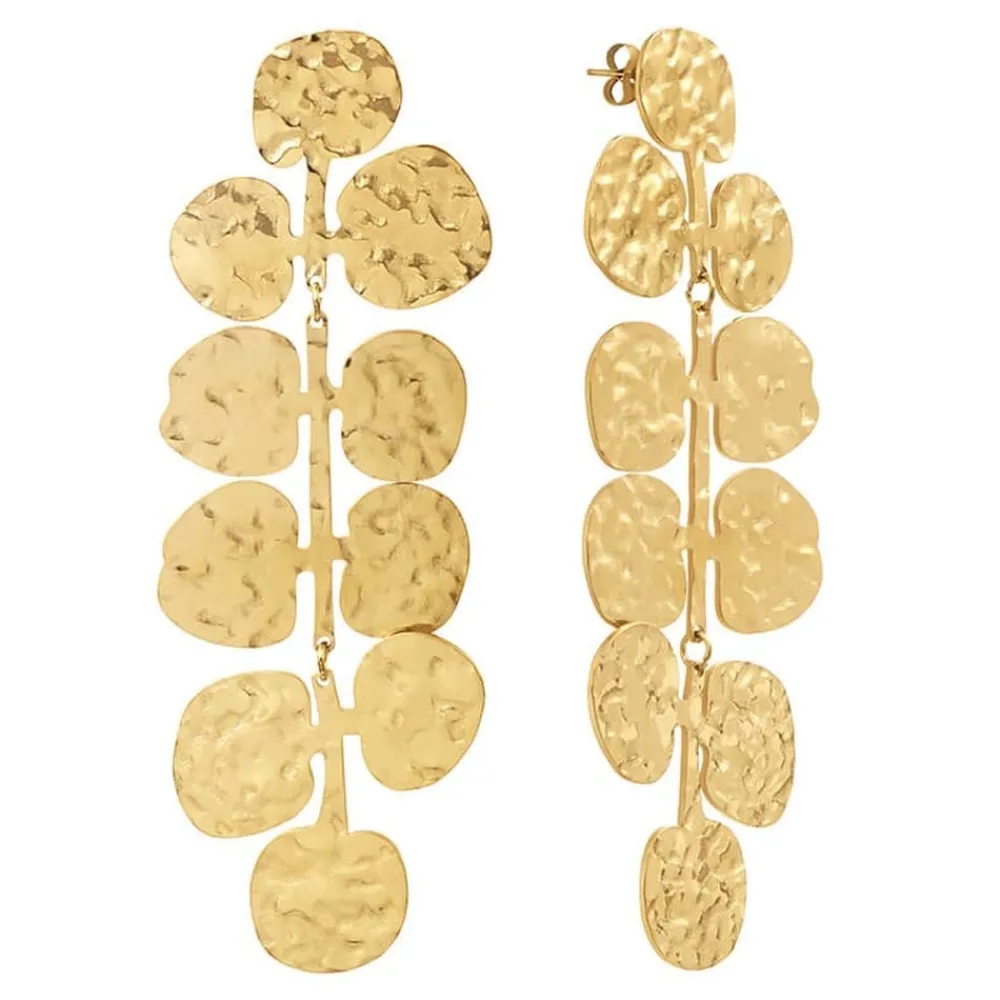 Boucles martelées pendantes en acier chirurgical trempé dans un bain doré signées Siloé, agrémentées de pampilles.