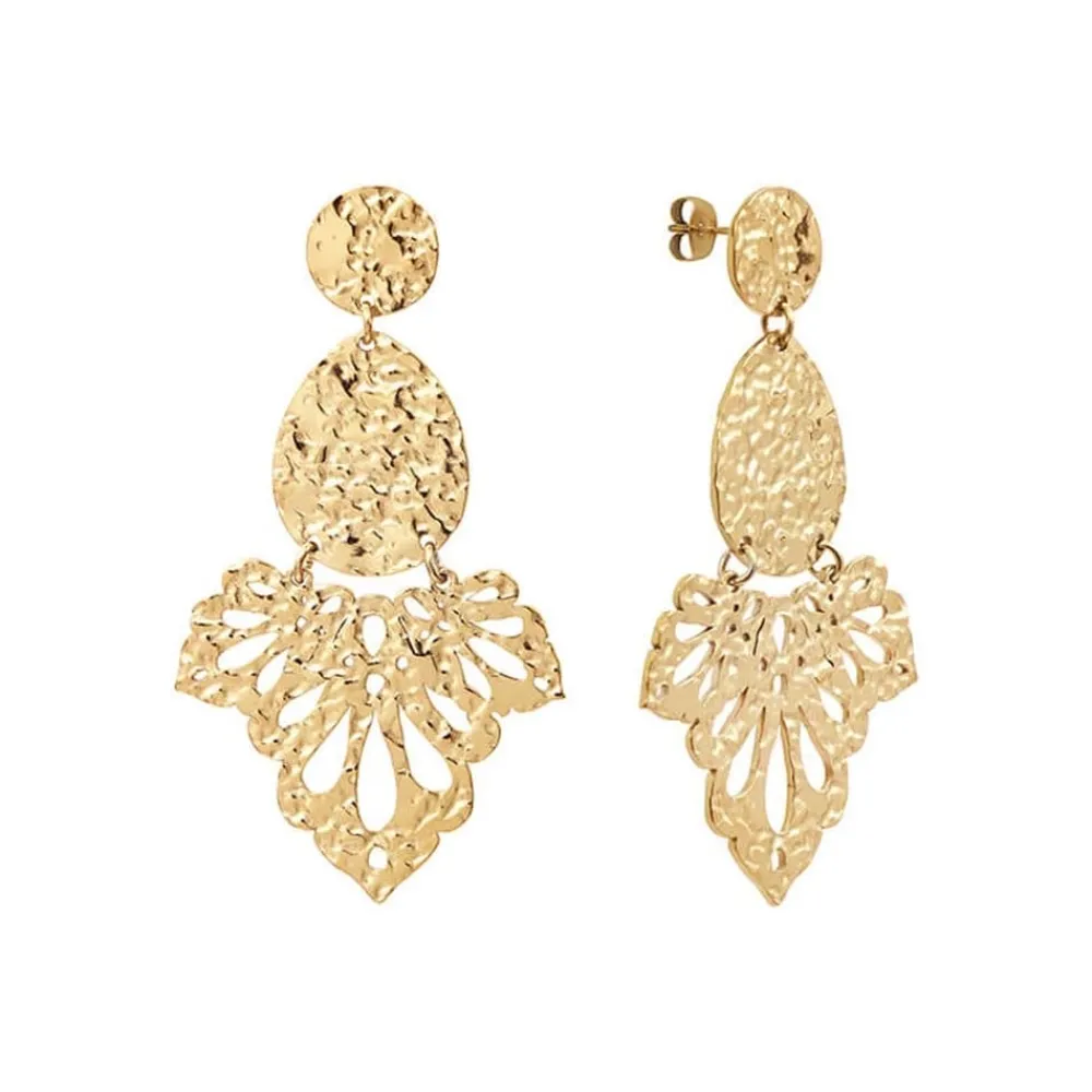 Boucles d’oreilles martelées en acier chirurgical trempé dans un bain doré signées Siloé.
