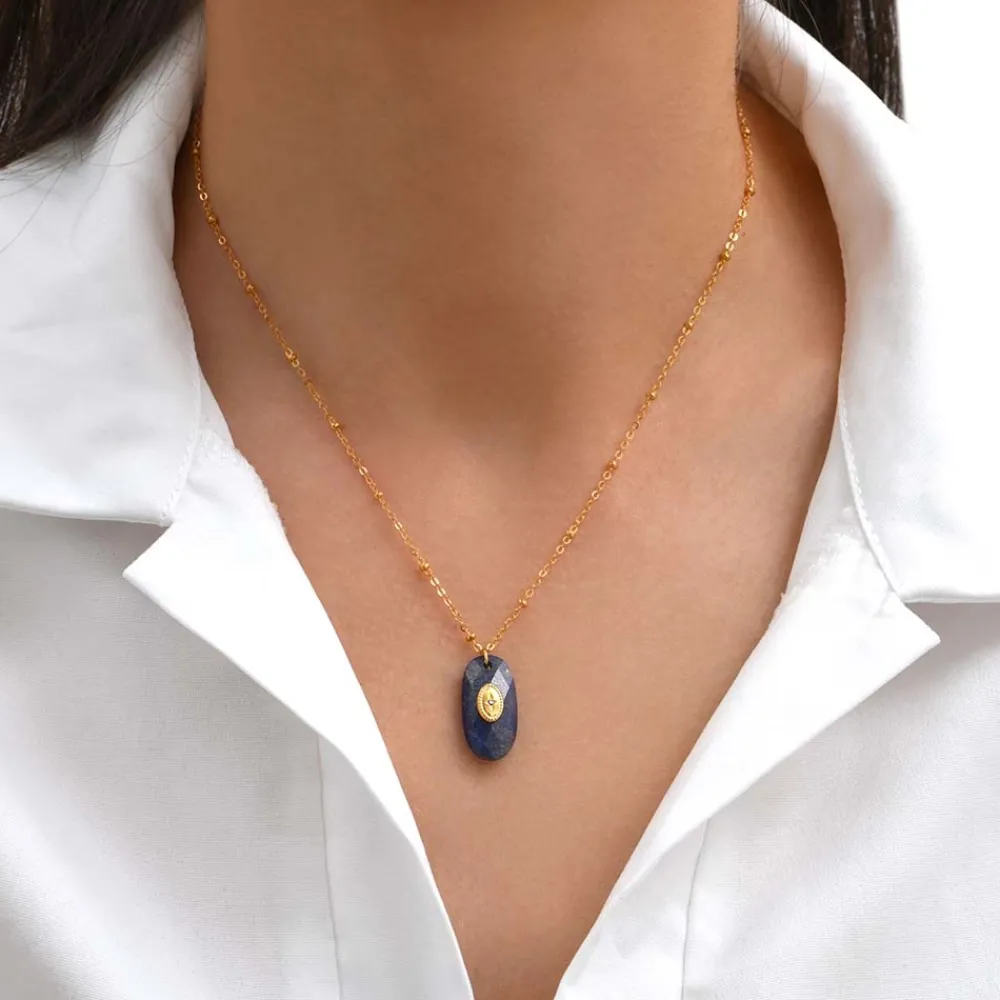 Ce collier signé By Jollia, est composé d’une pierre en lapis lazuli et d’une petite croix en acier doré.