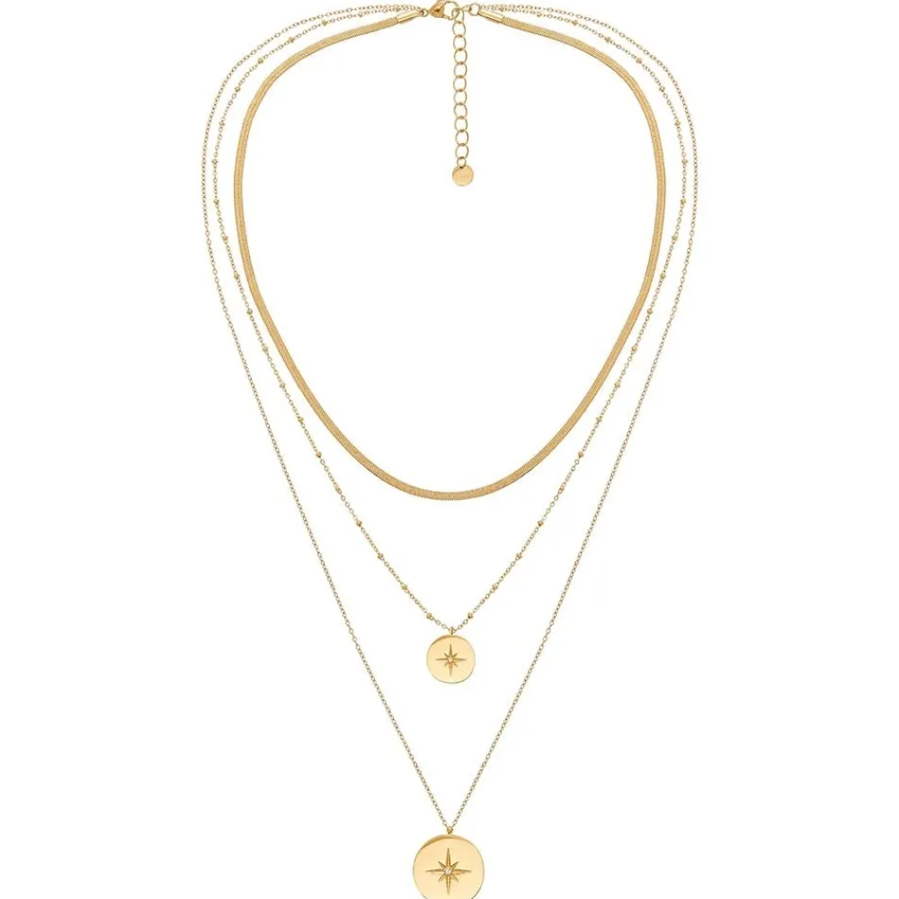 Collier multi rangs effet serpent et pendentif étoile polaire. Il est en acier chirurgical trempé dans un bain doré.