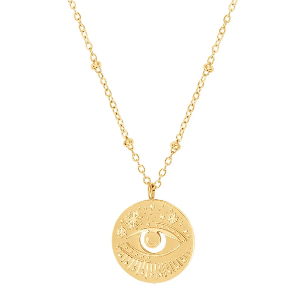 Collier pendentif avec oeil étoilé, en acier inoxydable doré signé Siloé.