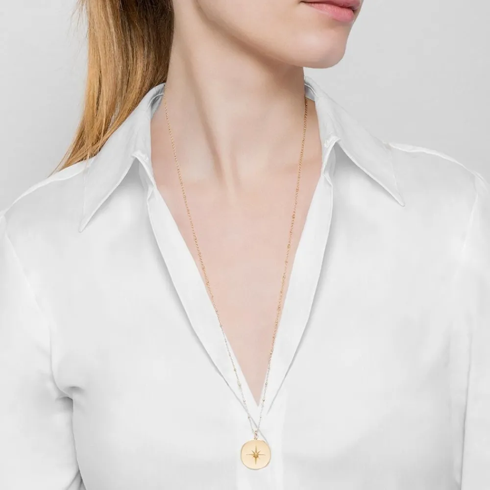 Collier doté d’une chaine perlée avec une médaille étoile qui détient une bille épaisse dorée.Longueur déployée…