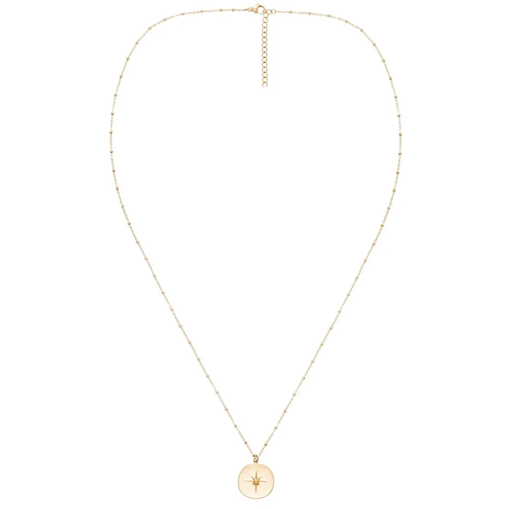 Collier doté d’une chaine perlée avec une médaille étoile qui détient une bille épaisse dorée.