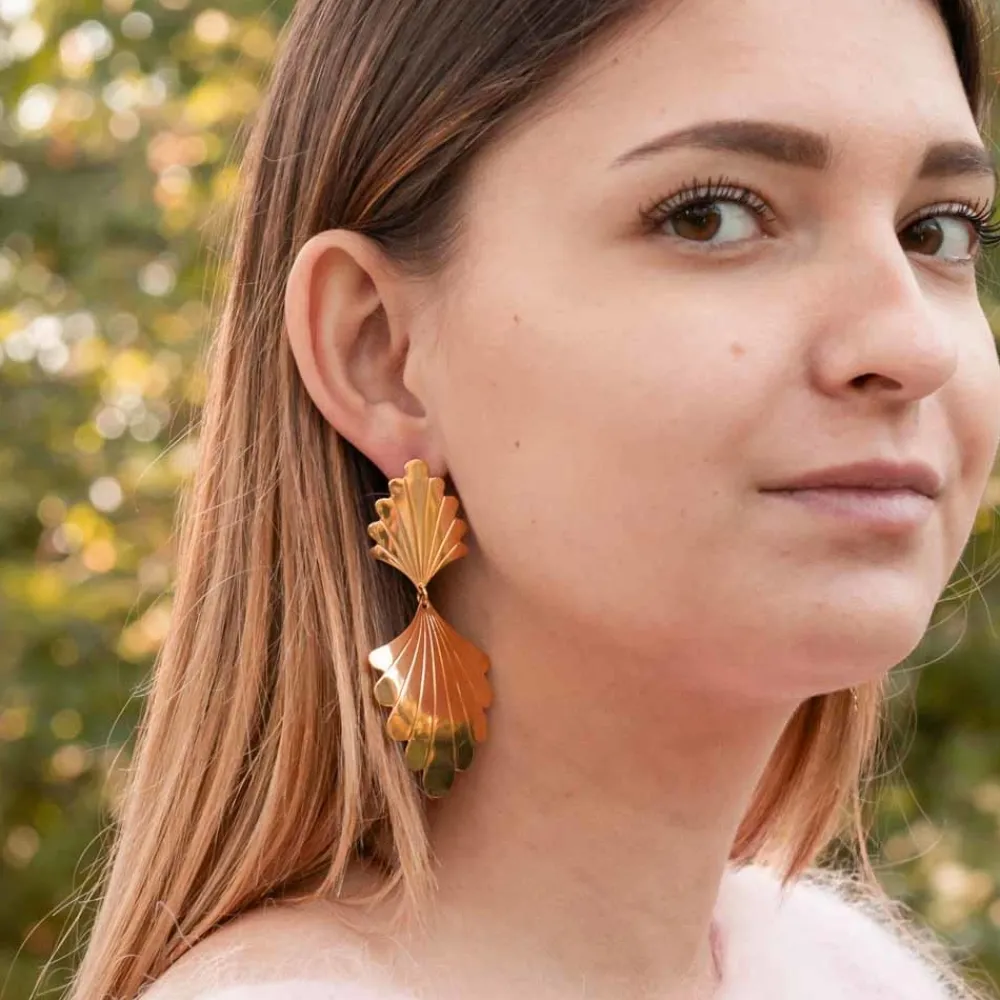 Boucles pendantes feuilles dorées signées Viadoli, dorées à l’or fin 24k.