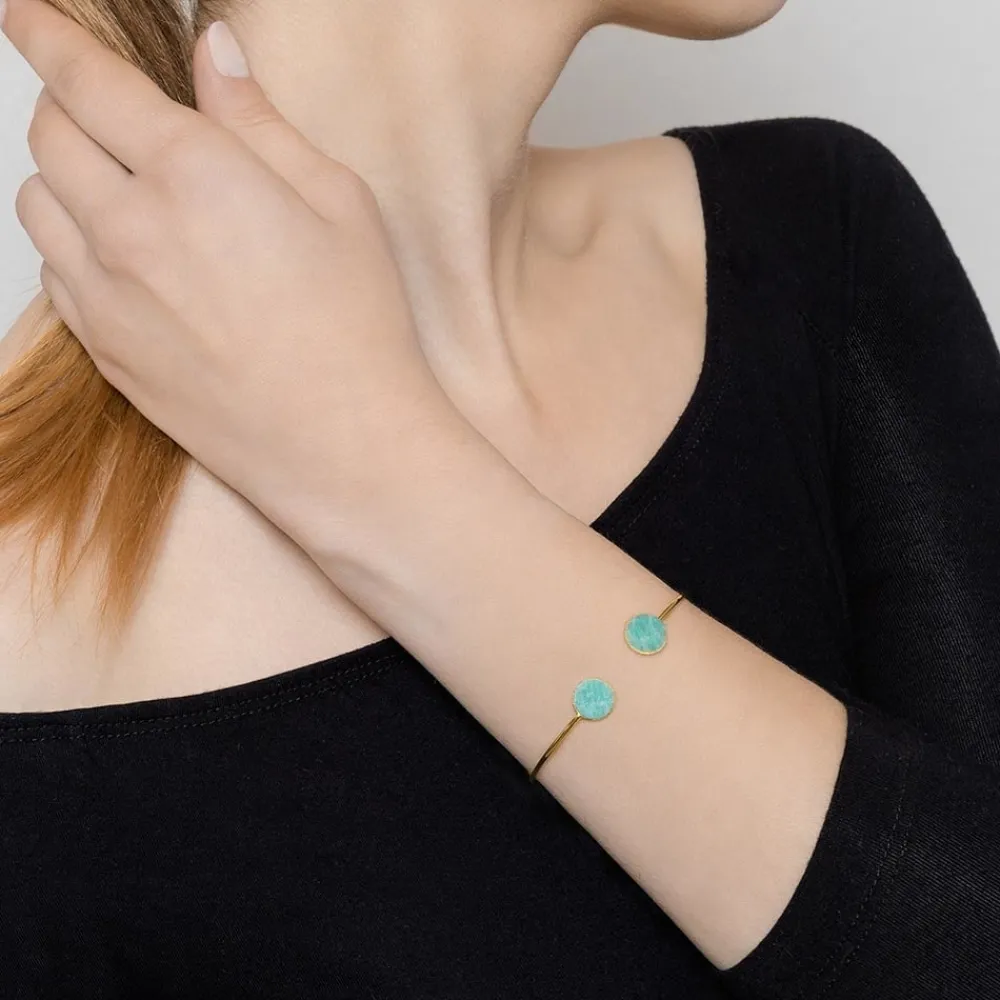 Bracelet signé Viadoli, en plaqué or 3 microns. Le jonc est ouvert et orné de pierres plates rondes aux extrémités en amazonite.