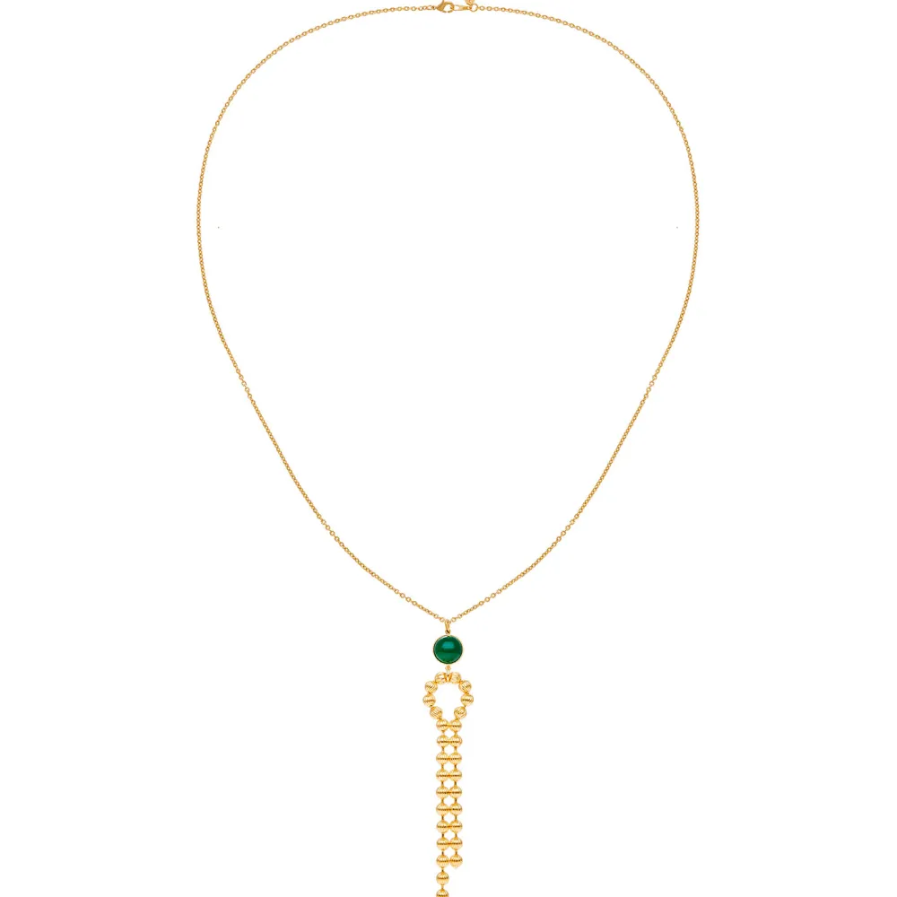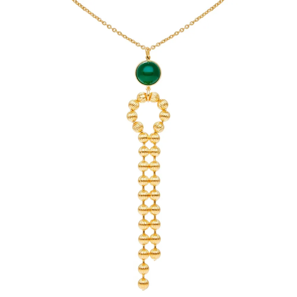 Collier long pendentif style art déco orné d’une pierre en agate verte signé Viadoli, doré à l’or fin 24k.