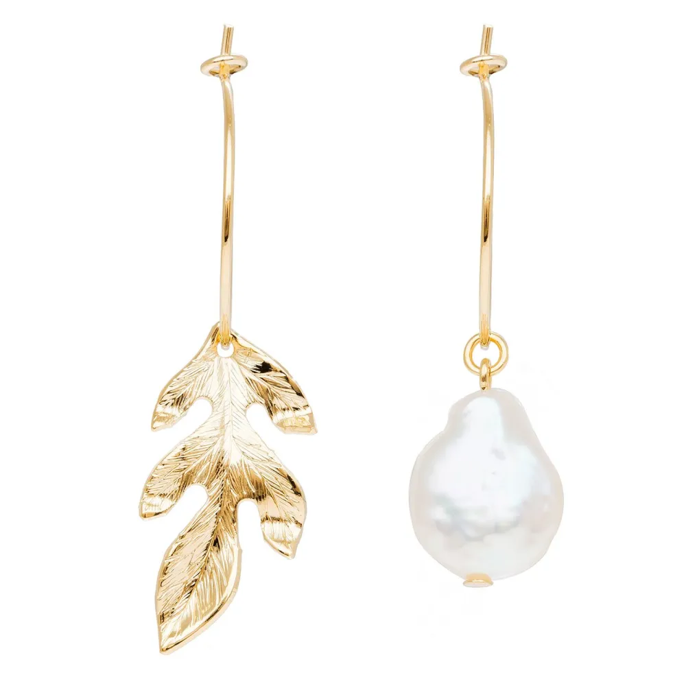 Mini boucles asymétrique : une perle nacrée ainsi qu’une feuille dorée signées Viadoli, dorées à l’or fin 24k.