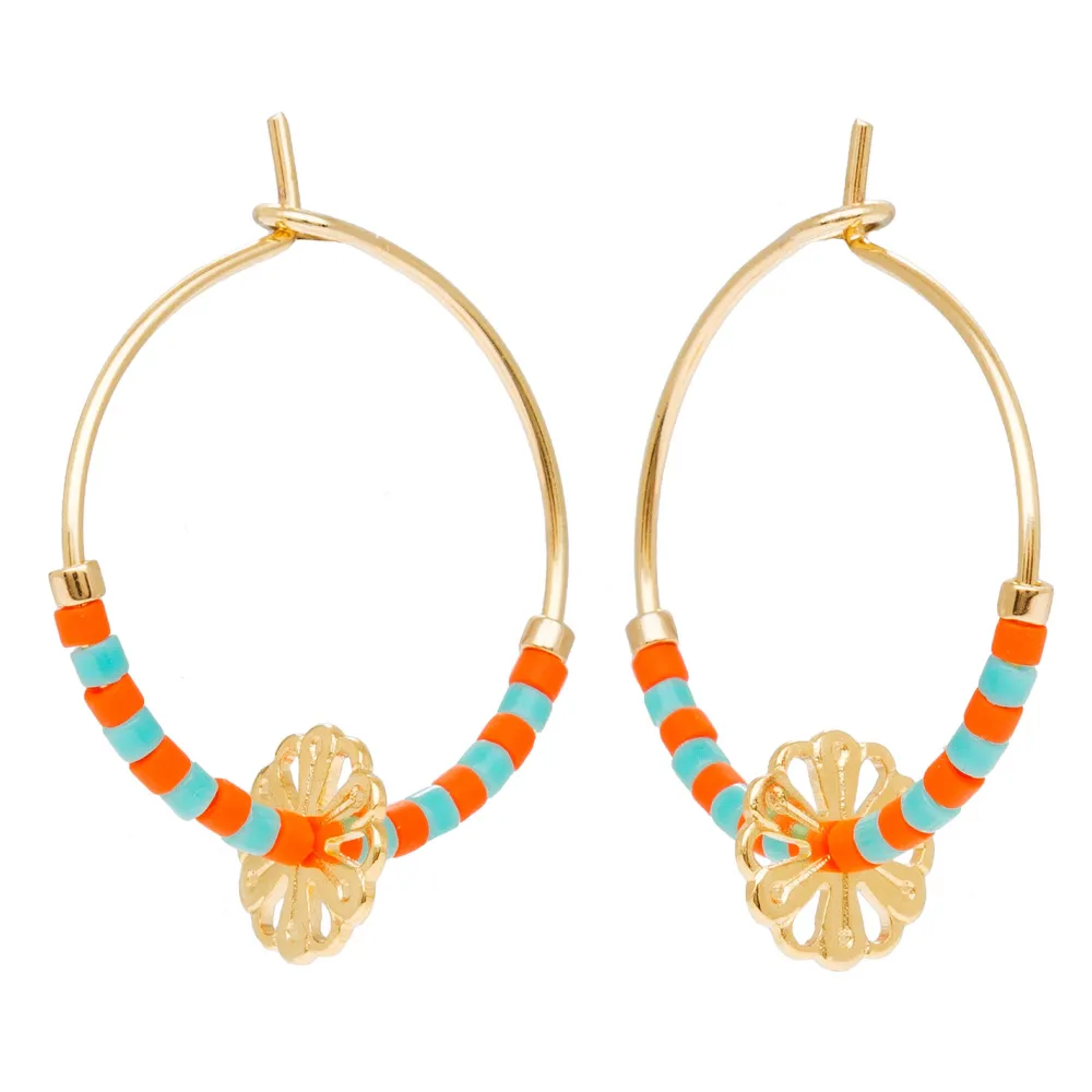 Créoles dorées, pierres turquoise et corail signées Viadoli, dorées à l’or fin 24k.Retrouvez les autres bijoux de l…