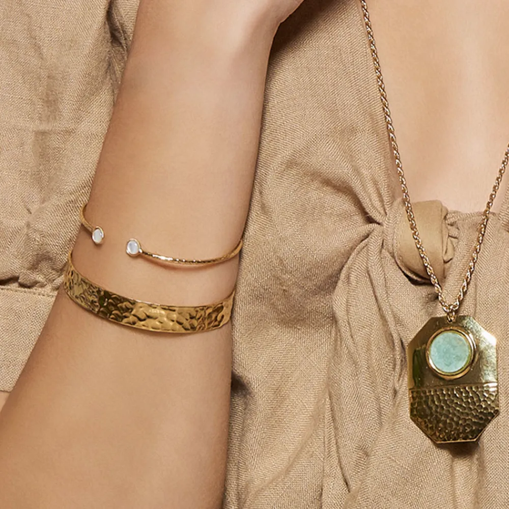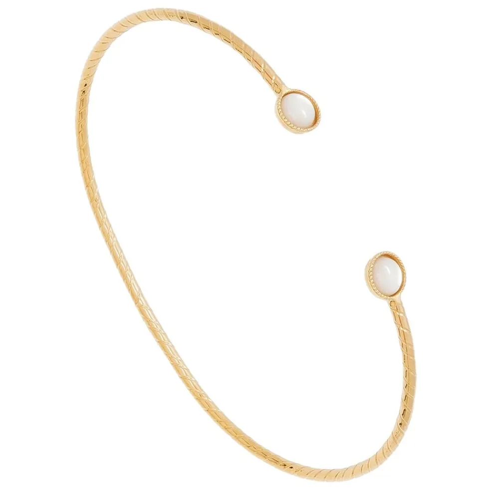 Jonc signé Viadoli, en plaqué or 3 microns. Le bracelet est strié tout le long. Il est ouvert sur le dessus et orné de deux pierres rondes en nacre.