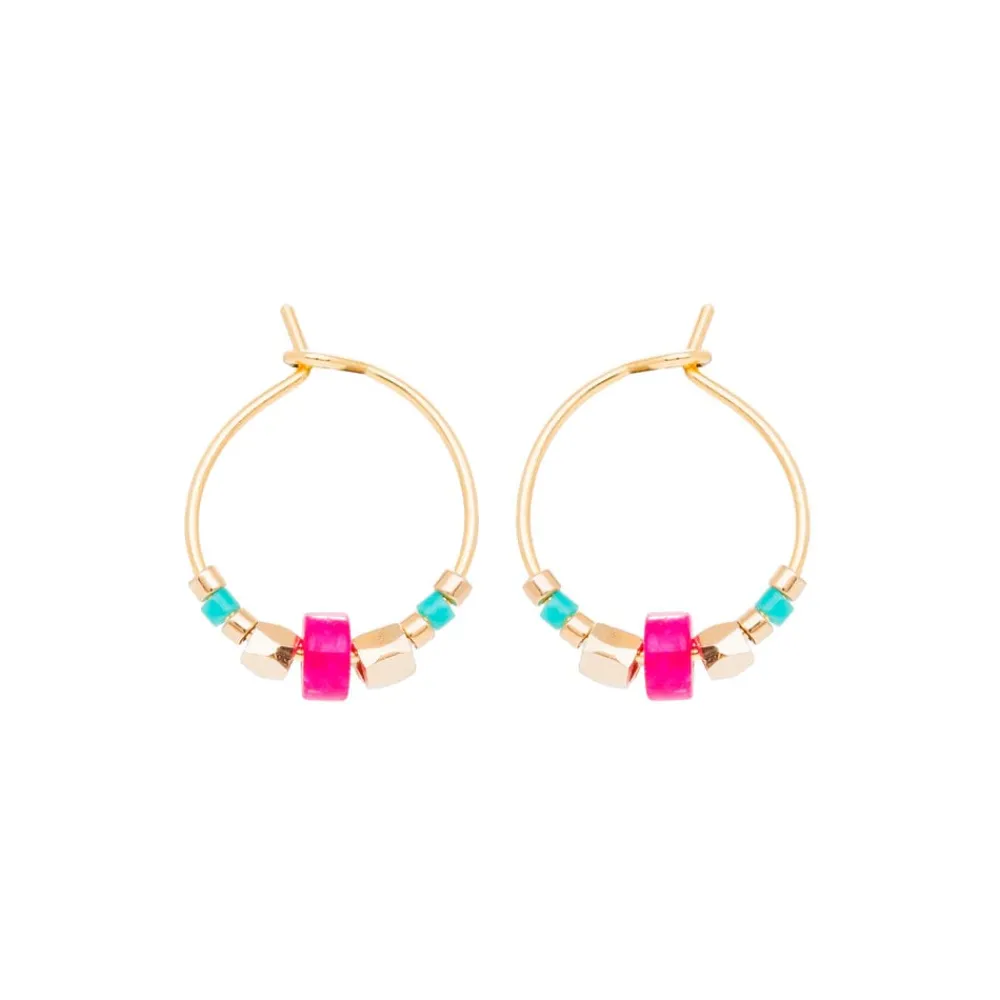 Les boucles sont ornées de perles dorées et de pierres de couleur fuschia.