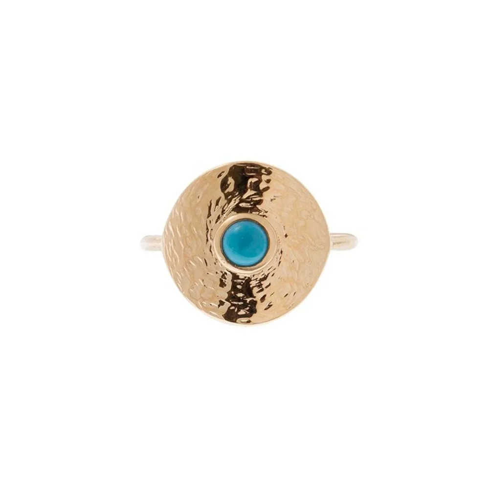 Cette bague signée Jollia est un véritable bijou bohème et ethnique. Elle est composée d’une médaille texturée en plaqué or sertie d’une pierre turquoise en son centre.