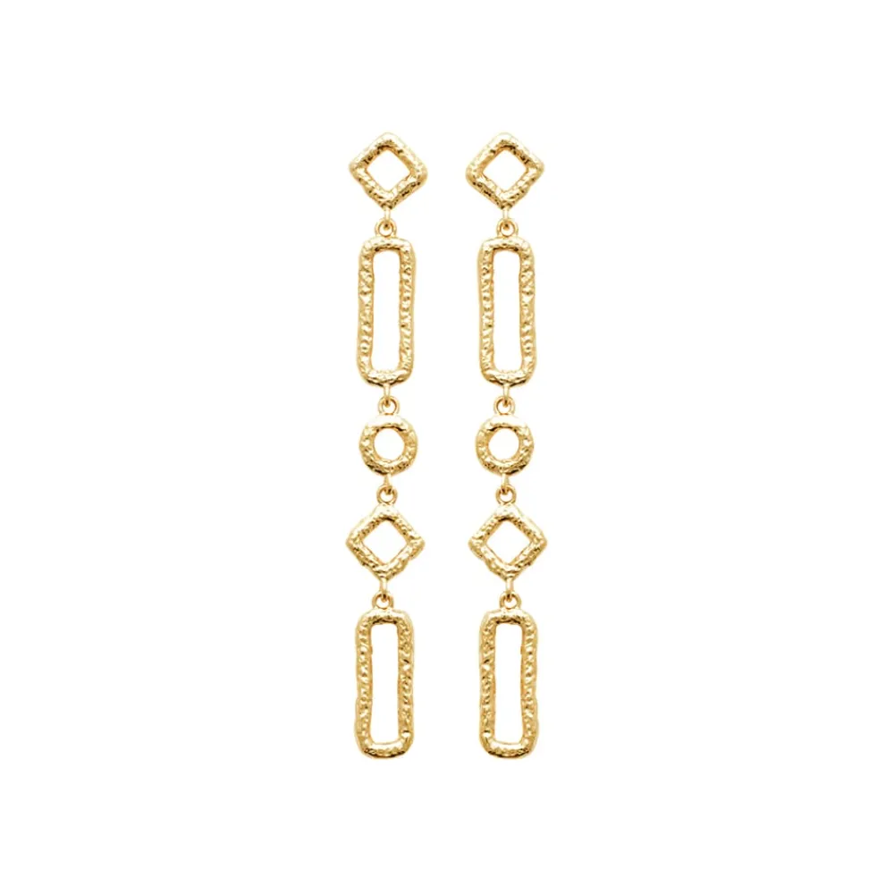 Boucles d’oreilles pendantes, plaqué or, aux motifs géométriques. L’effet irrégulier du métal brossé donne une petite touche ancienne au modèle.