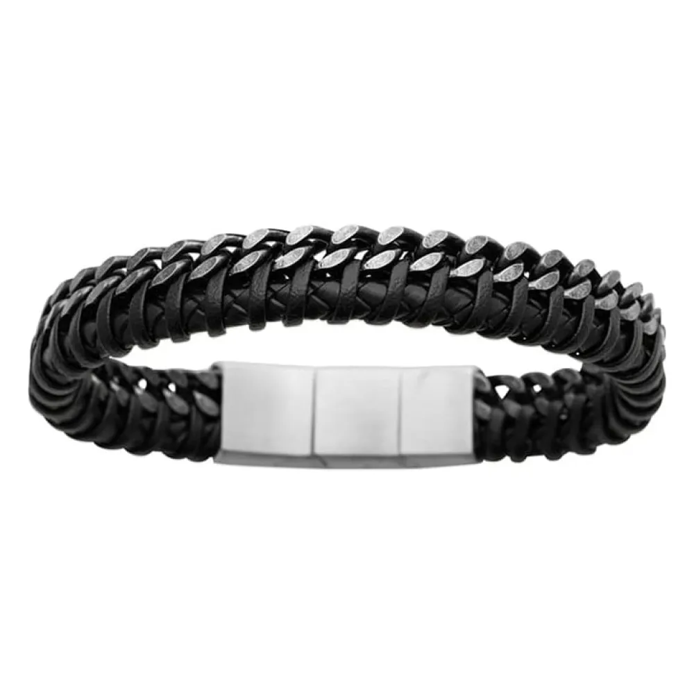 Bracelet pour homme en cuir épais tressé dans la chaîne maille gourmette effet argent noircit. Retrouvez toute la c…