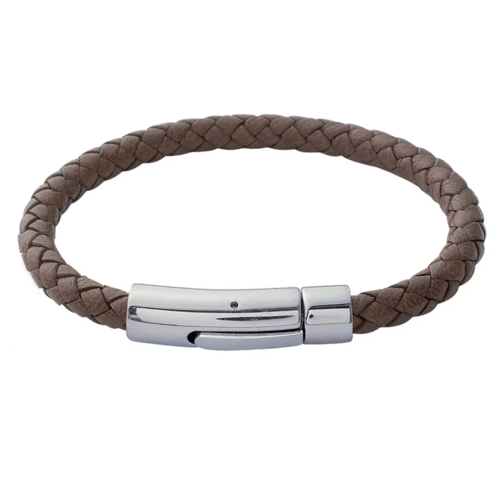 Bracelet Homme en cuir tressé ecoloris chocolat se ferme par un tube clip en acier inoxydable.