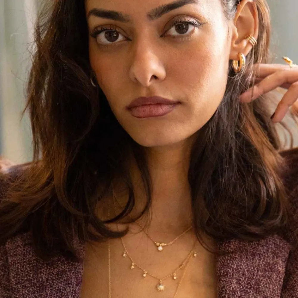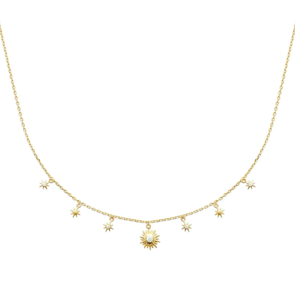 Signé By Jollia, Collier petits soleils plaqué or et zirconimus. Un motif central relevé de 3 mini-soleils de chaque côté.
