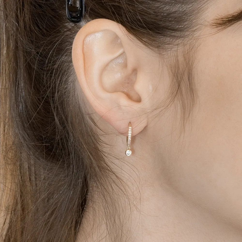 Ces mini créoles composées de petits strass et agrémentées d’un zircon bleu sont en plaqué or et signées By Jollia…