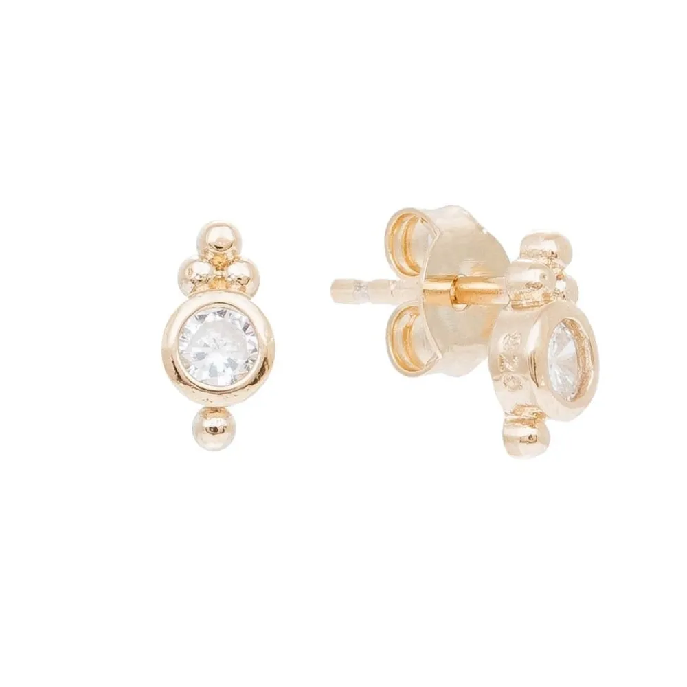 Ces puces d’oreilles signées By Jollia, sont en plaqué or. Elles sont ornées d’un cristal entouré de détails dorés.