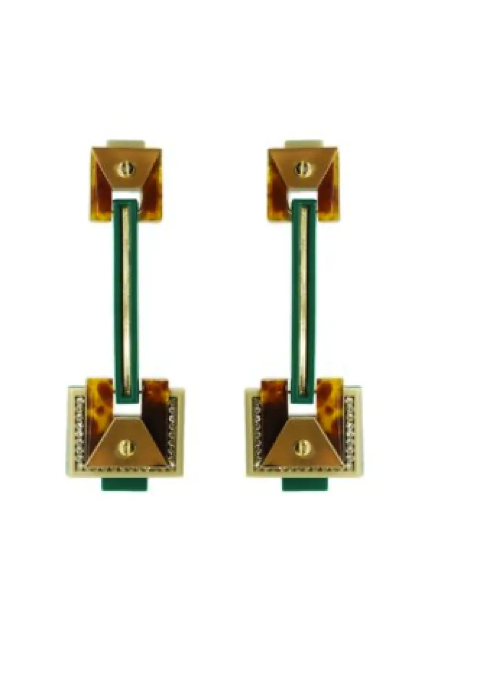 Boucle d’oreille signé Gissa Bicalho. Boucles en acrylique, modèle long articulé, avec application de strass en verre, filigrane et chaîne, boucle d’oreille avec épingle en laiton, métaux finition dorée.