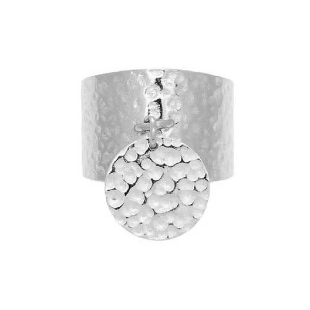 Bague large martelée en acier chirurgical trempé dans un bain doré et composée d’un pendentif martelé et sélection…