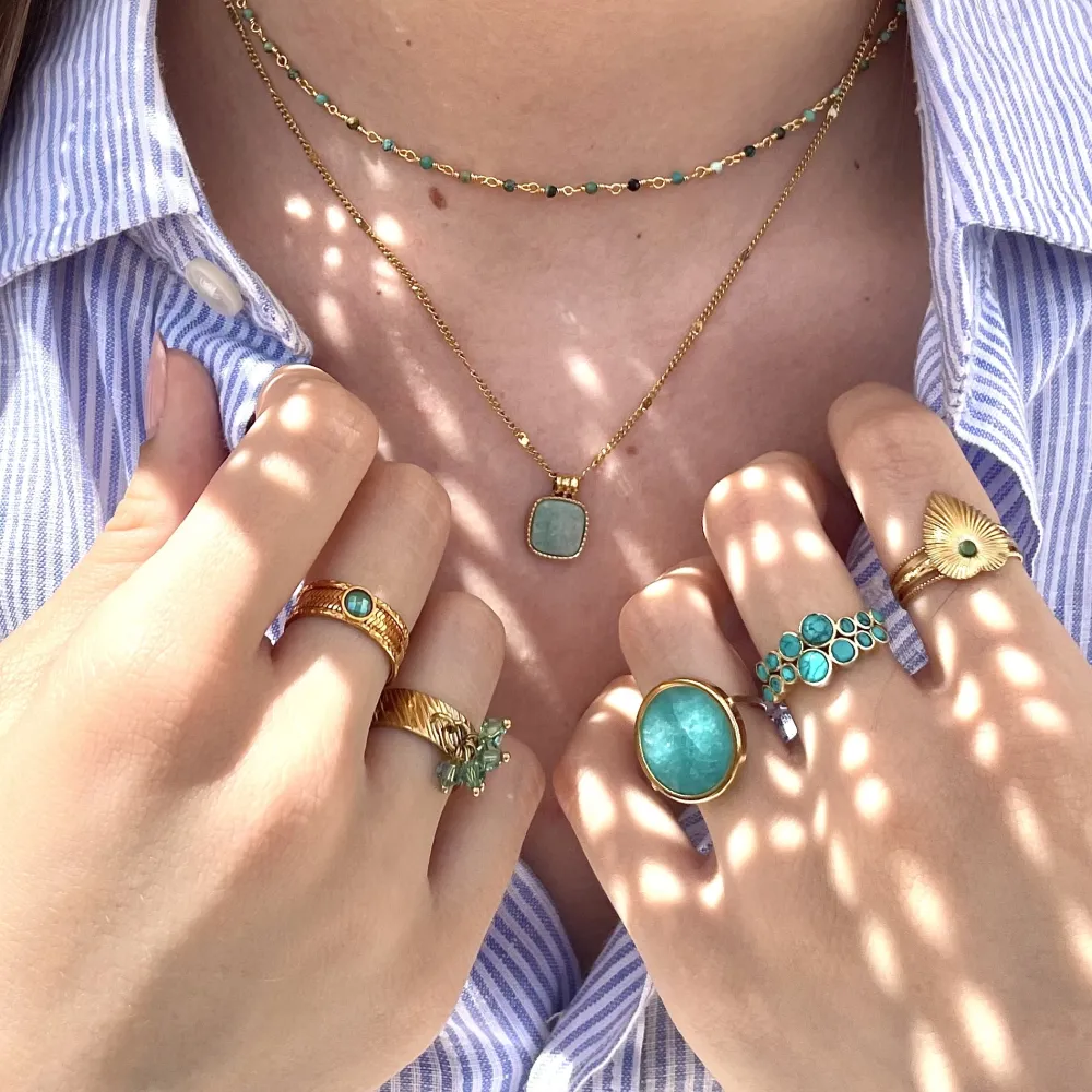 Cette bague signée Siloé est un véritable bijou de raffinement et de délicatesse. Fabriquée en acier inoxydable doré, elle est ornée d’une pierre de verre turquoise qui lui apporte une touche de couleur. Sa taille réglable permet de l’adapter facilement.