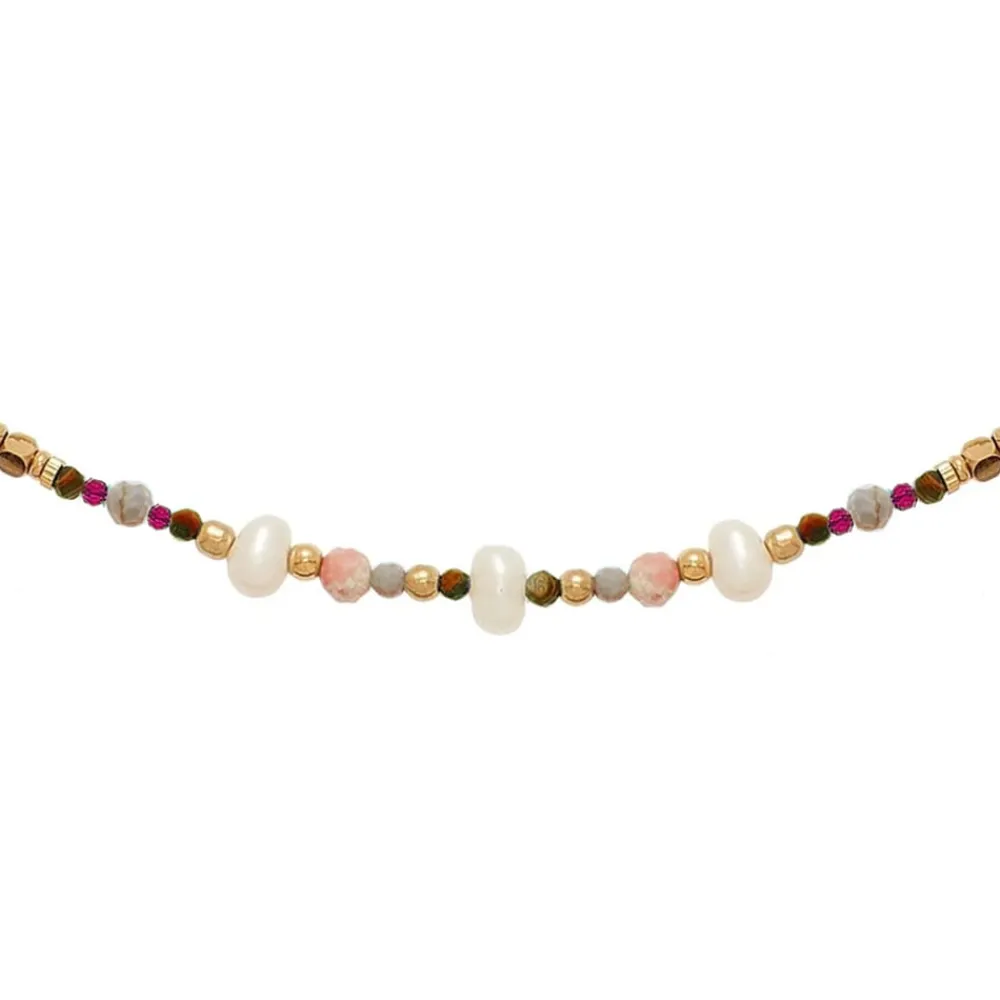 Collier de plusieurs perles en pierres naturelles dans un camaïeu de rose et perles naturelles d’eau douce. Toutes les perles métal et pièces métalliques sont en acier inoxydable doré signé Siloé.
