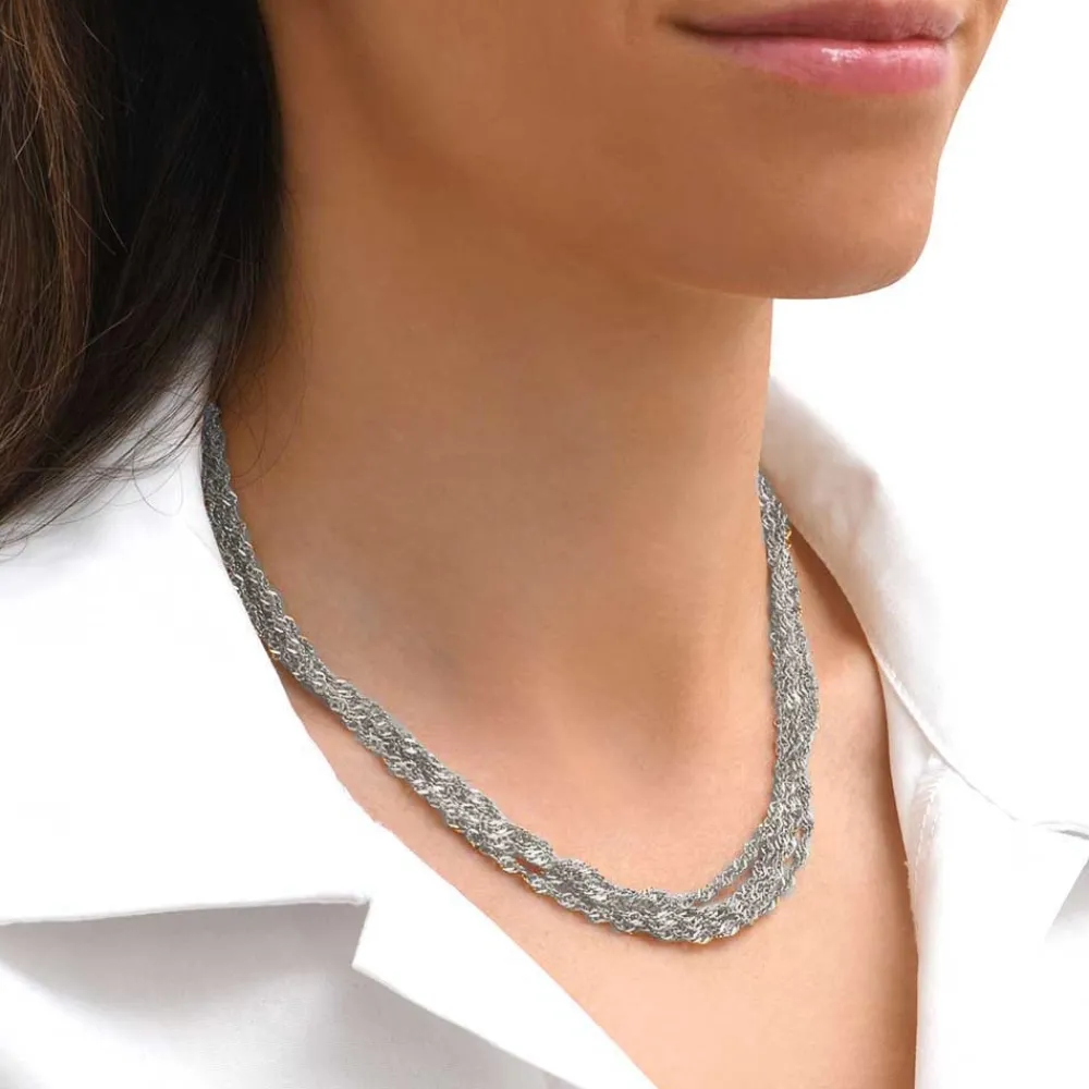 Collier multi torsades argenté en acier inoxydable trempé dans un bain doré se composent de 5 chaine torsadés, signé Siloé.