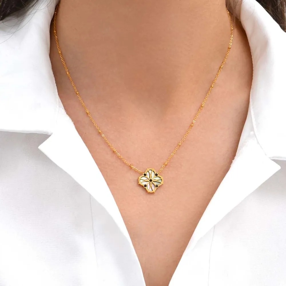 Ce collier signées Siloé est composées d’une breloque en forme de trèfle, de pierre noires et d’un fond effet nacré.