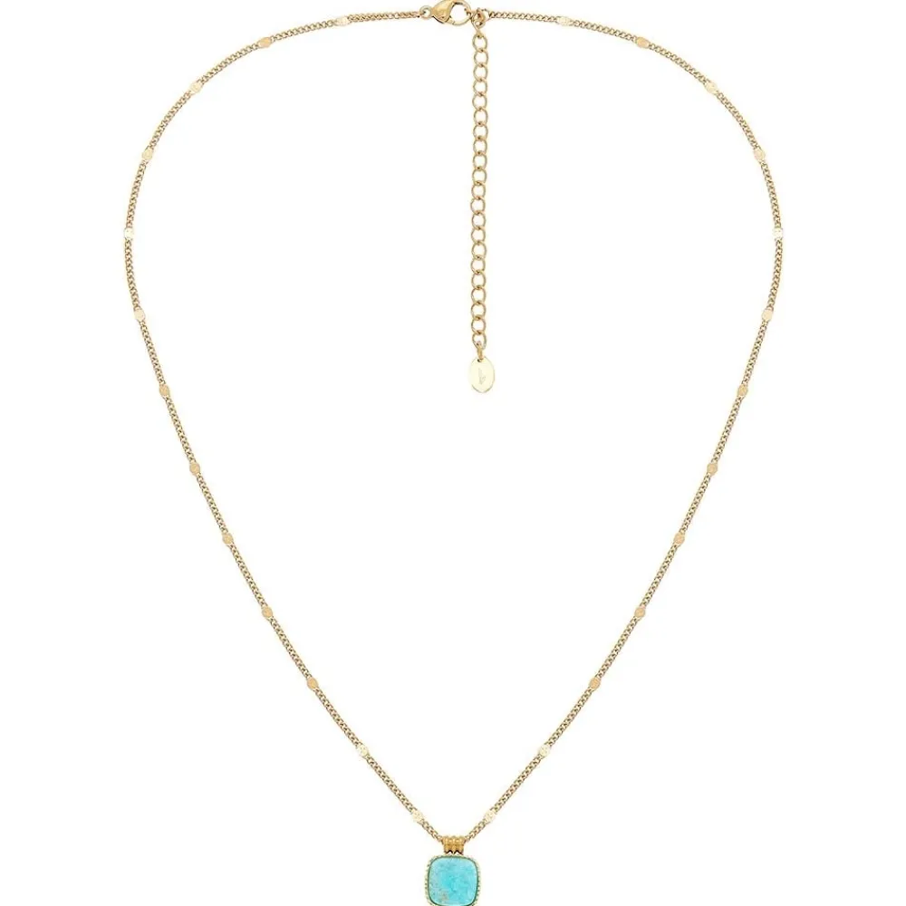 Le Collier Vintage turquoise de By Jollia est un bijou raffiné et simple à porter au quotidien. Son design intemporel est composé d’un médaillon carré avec une pierre effet amazonite suspendu à une chaîne fine en acier chirurgical doré.
