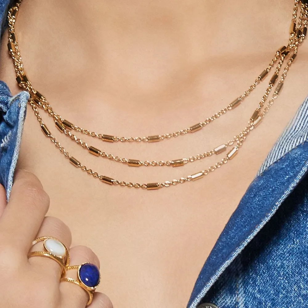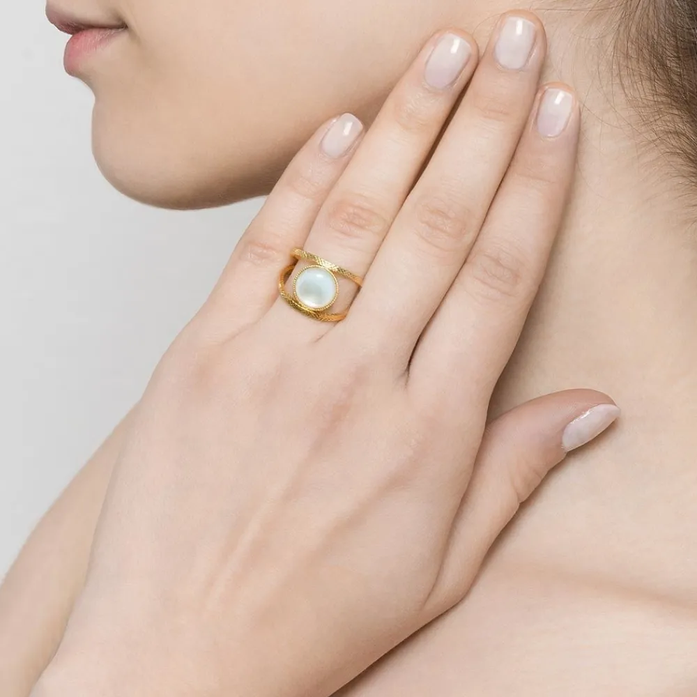 Bague double en plaqué or 3 microns signée Viadoli. Elle est ornée d’une pierre ronde en nacre.