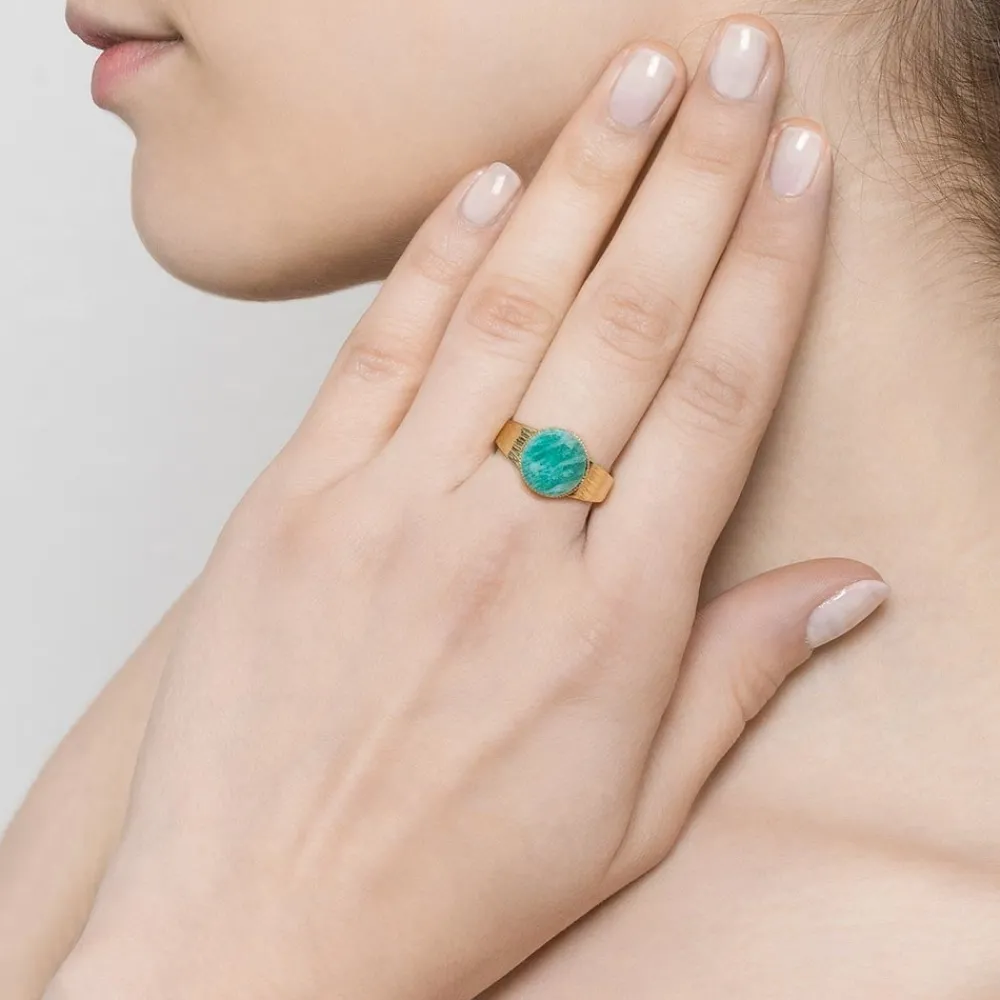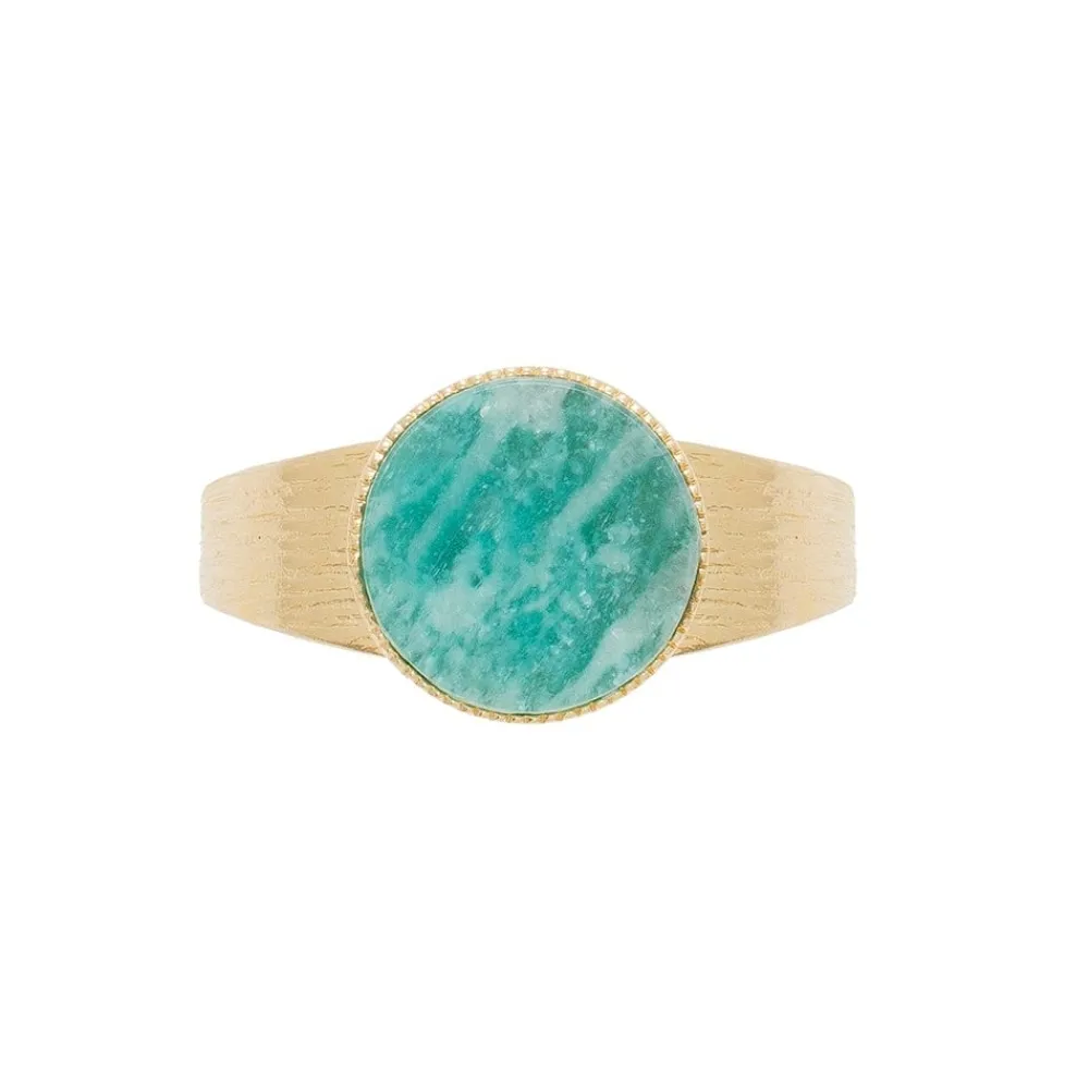 Bague double anneau dotée d’une pierre ronde en amazonite, en plaqué or 3 microns signée Viadoli.