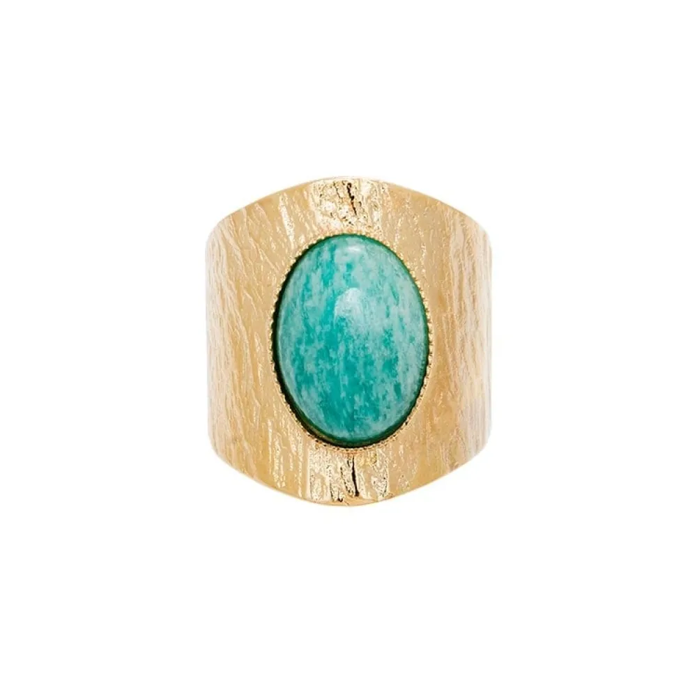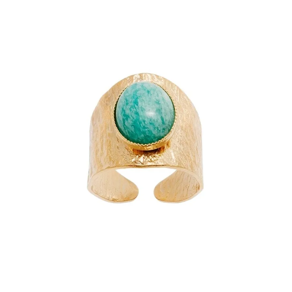 Bague de la collection Nymphéa en plaqué or 3 microns signée Viadoli. Elle est ornée d’une pierre semi-précieuse en amazonite