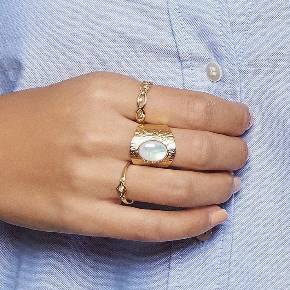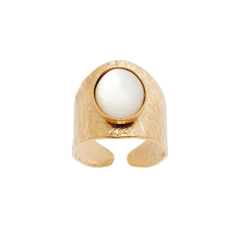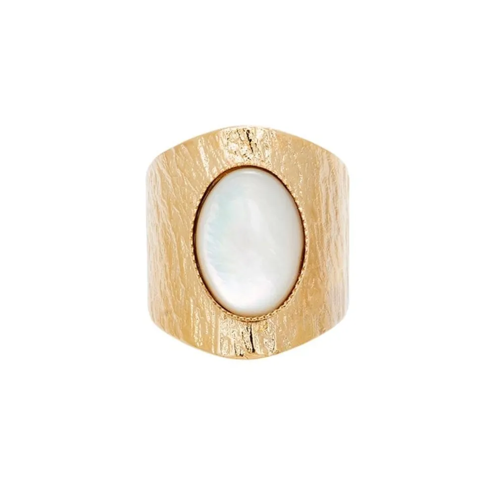 Bague de la collection Nymphéa en plaqué or 3 microns signée Viadoli. Elle est ornée d’une pierre semi-précieuse en nacre.