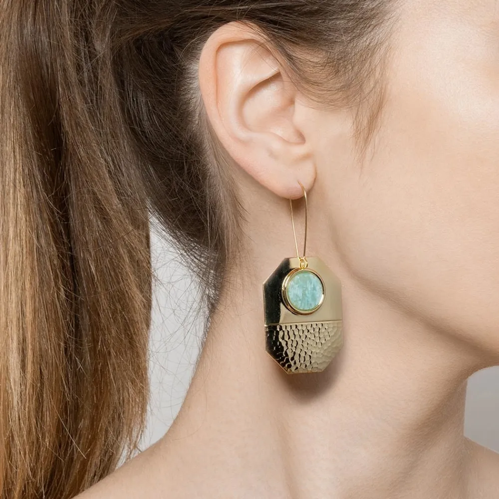 Les boucles sont ornées d’un pendentif ethnique martelé, agrémenté d’une pierre ronde amazonite.