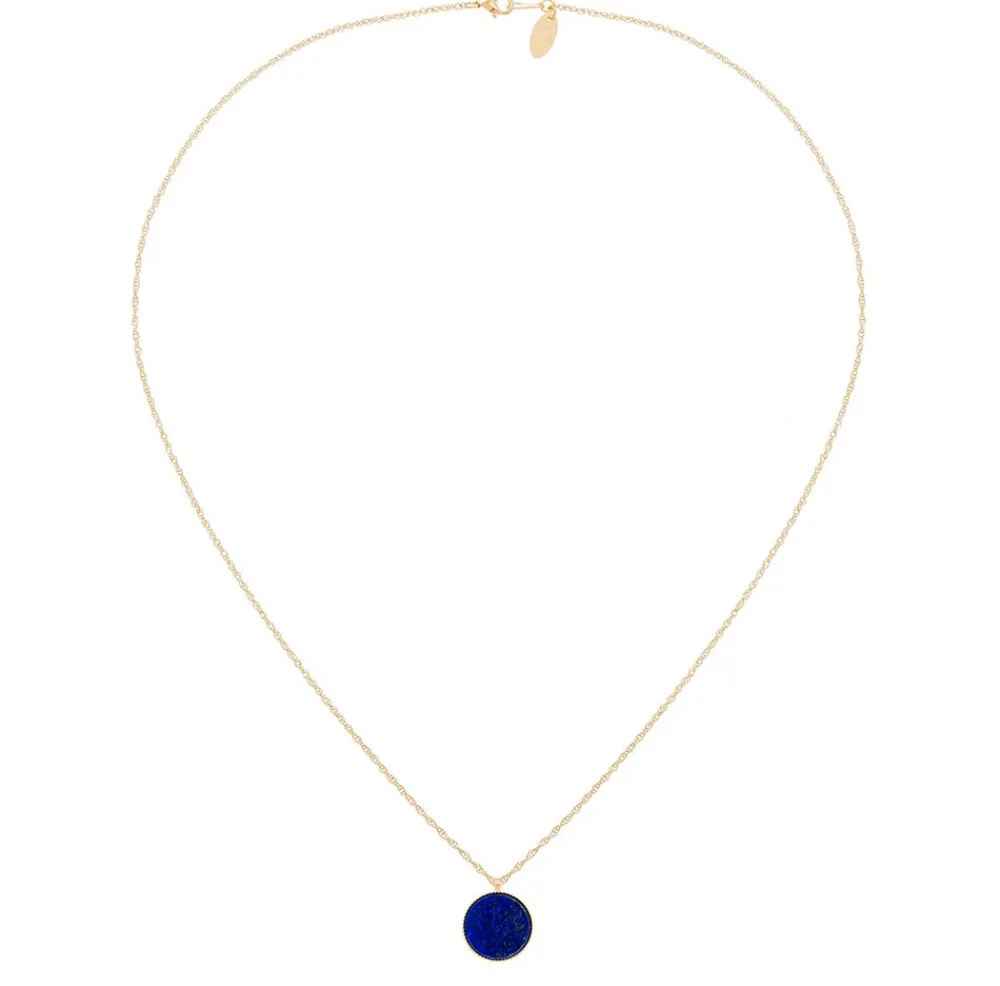 Le collier est orné d’un pendentif pierre ronde et plate en lapis lazuli.