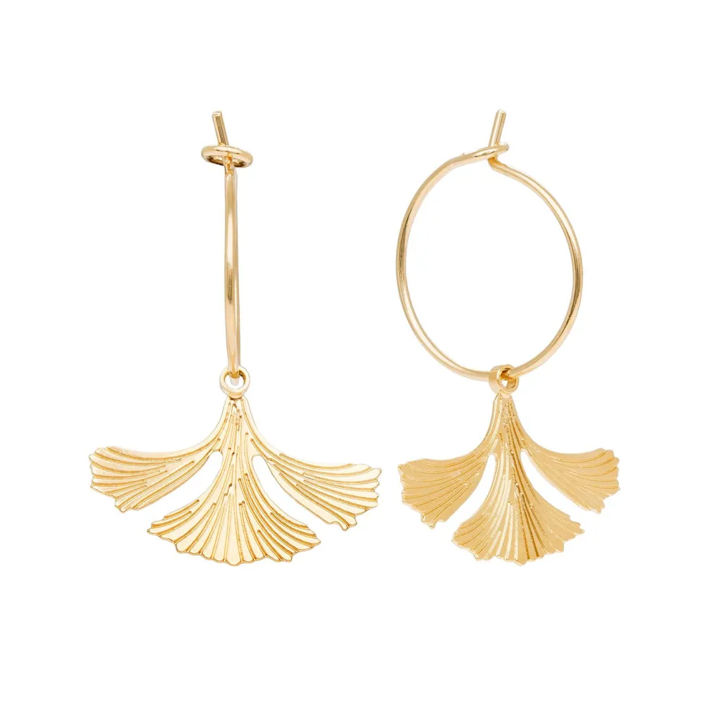 Petites créoles signées Viadoli, dorées à l’or fin 24k.Les motifs sont en forme de feuille de Ginkgo. Un intemporel …