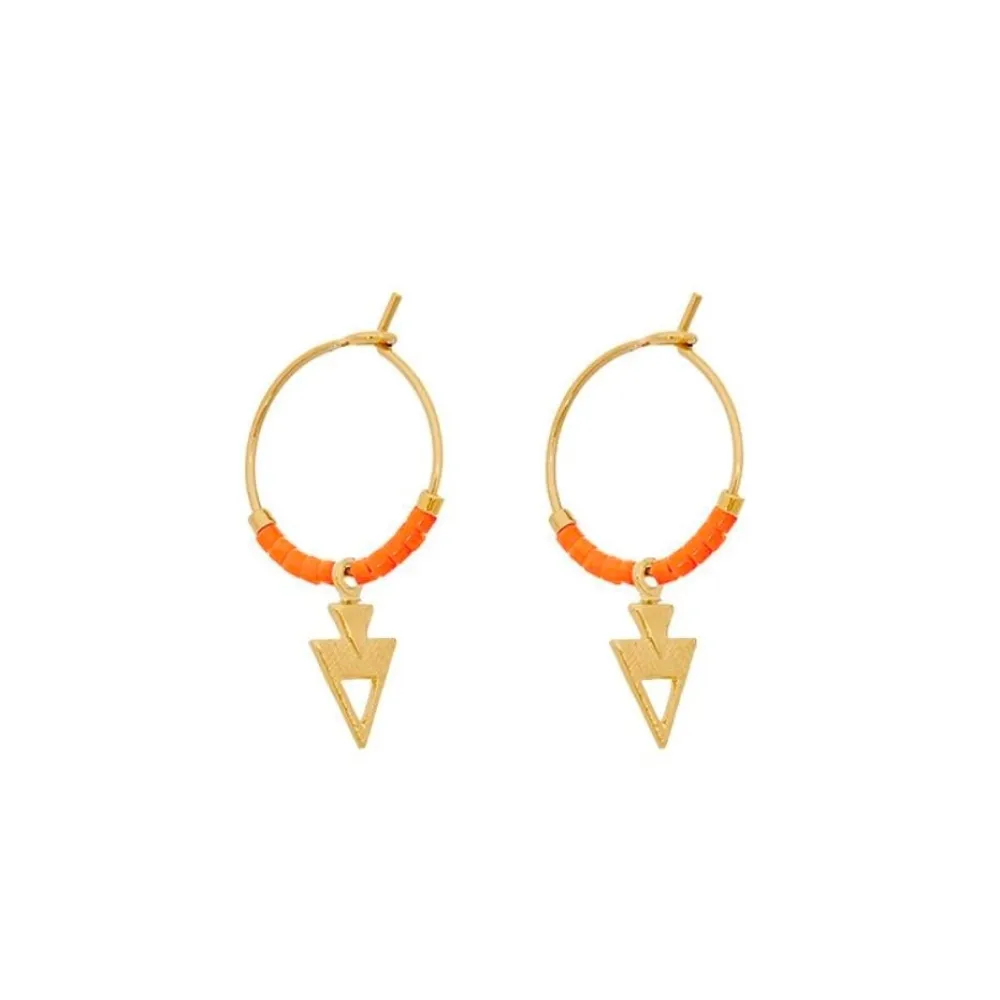 Boucles créoles en laiton doré à l’or fin 24 carats sans nickel, signées Viadoli. Elles sont composées d’un pendentif flèche et de perles miyuki orange.